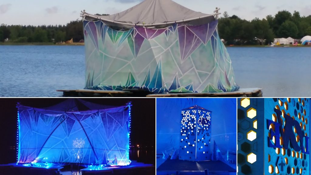 Description: Dedicated to the memory of Matt Vo, the Ice Temple is a floating bower with an entrance that encourages you to pass through the water boundary, climb inside another world, and commune with those we have lost. Write on the glowing, musical sculpture that will be ignited later, relax on soft pads, and take a moment away from revelry to recenter.